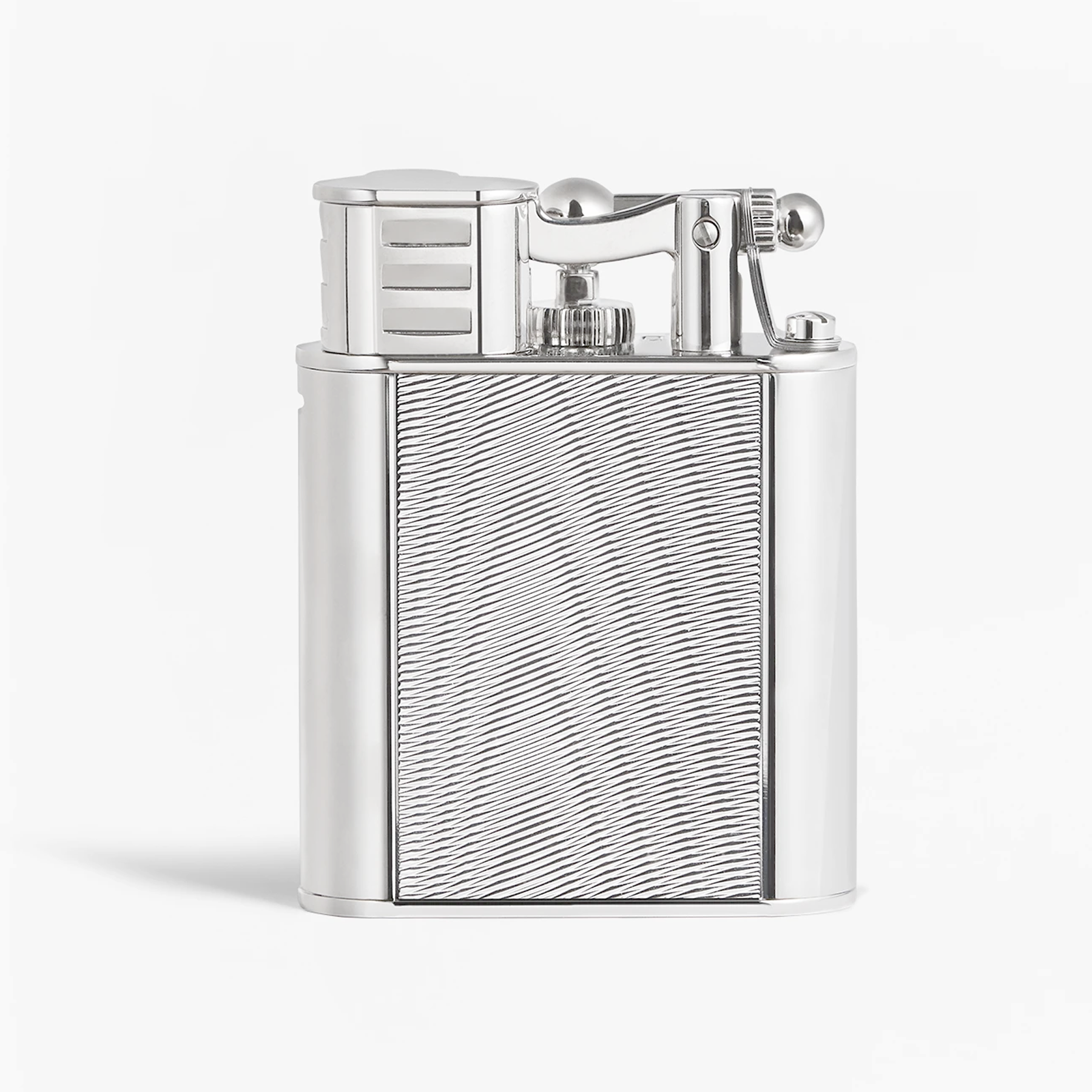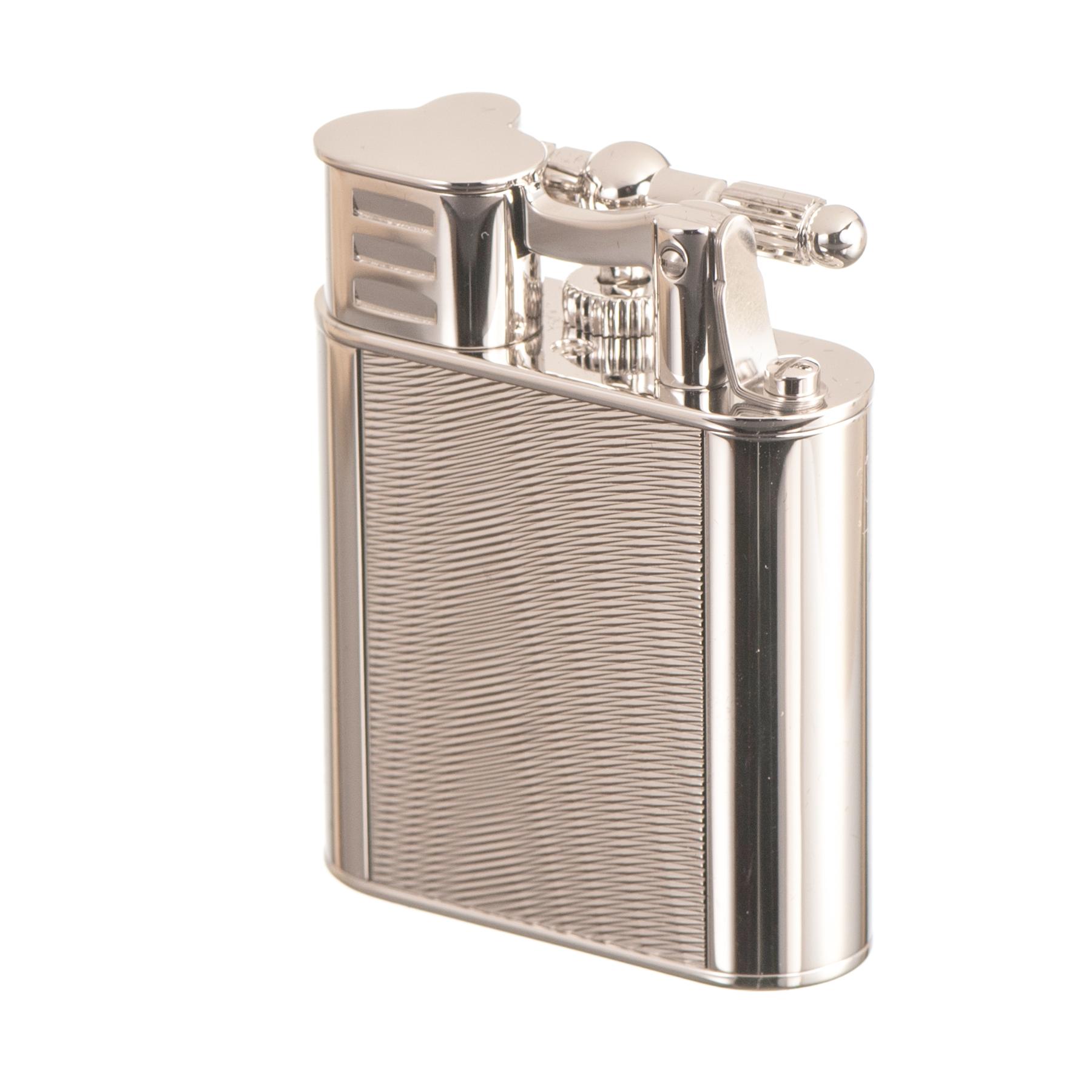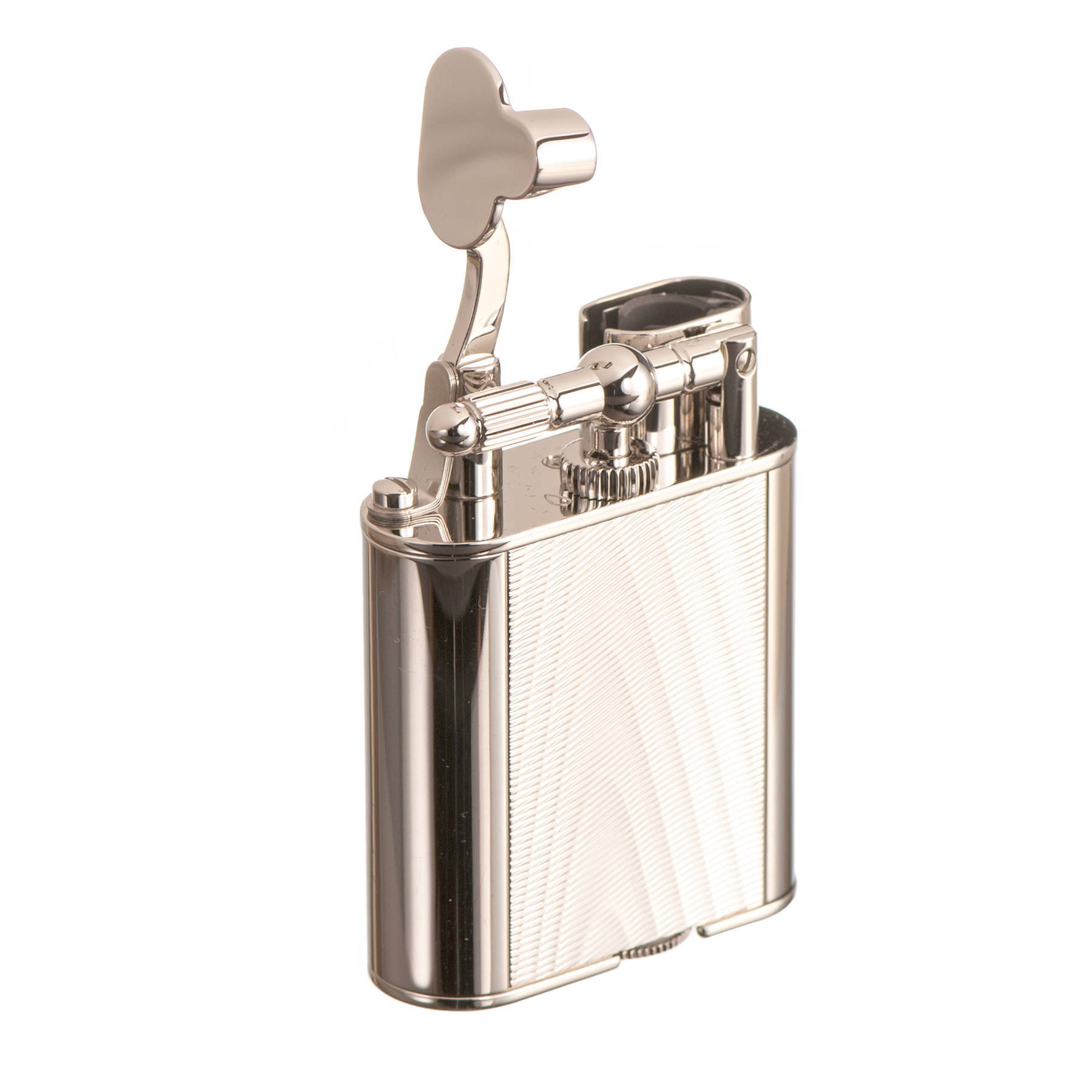 The beautiful palladium plated exterior is affixed with a an engraved panel inspired by the soft, shimmering lines of silk moiré fabric.