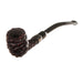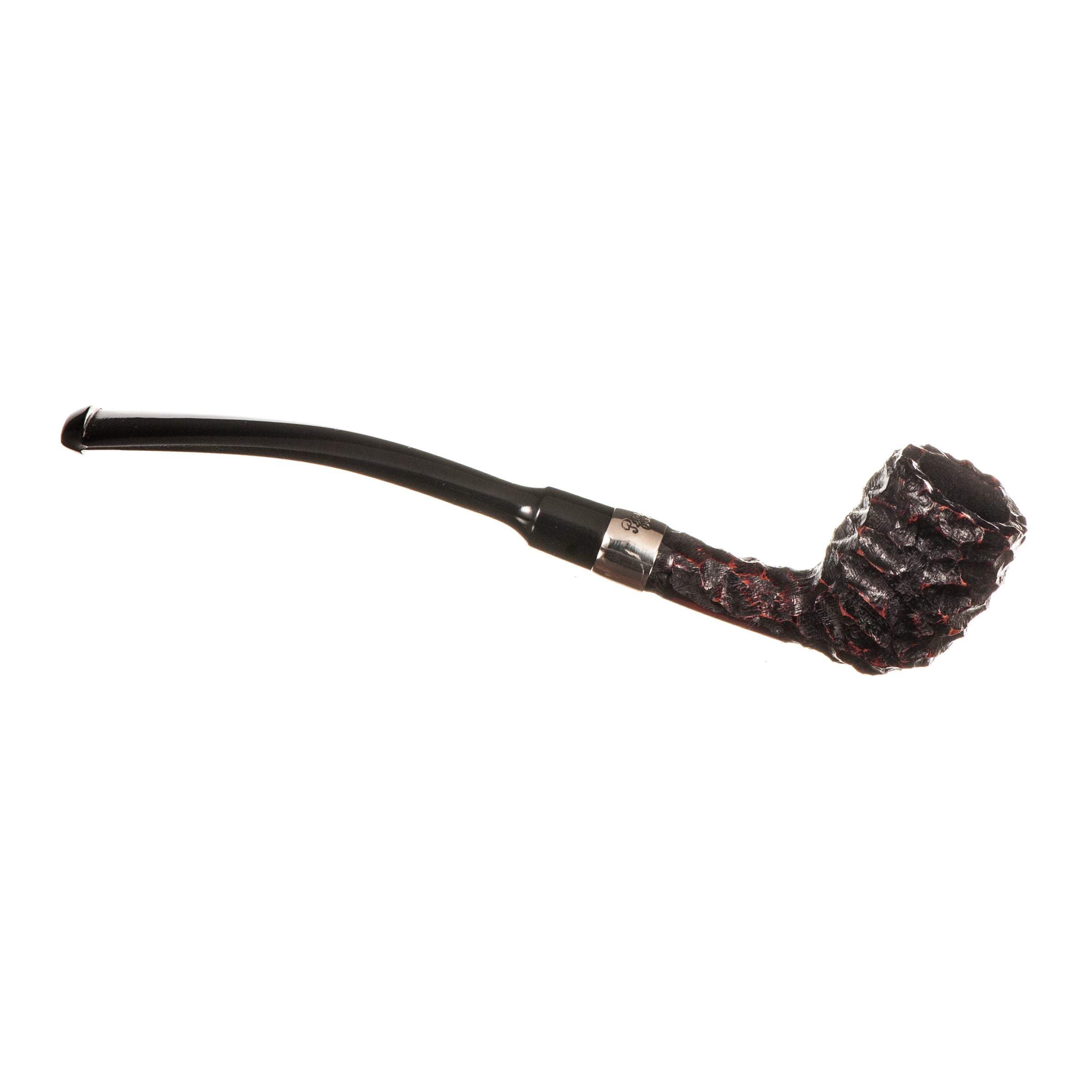 This petite pipe is part of Peterson's specialty shapes series of pipes. A distinct Belgique shape reminiscent of a pipe fitted to a fairy tail with its long slender, knobby shape. Available here in a rusticated finish with deep black tones and red highlights.