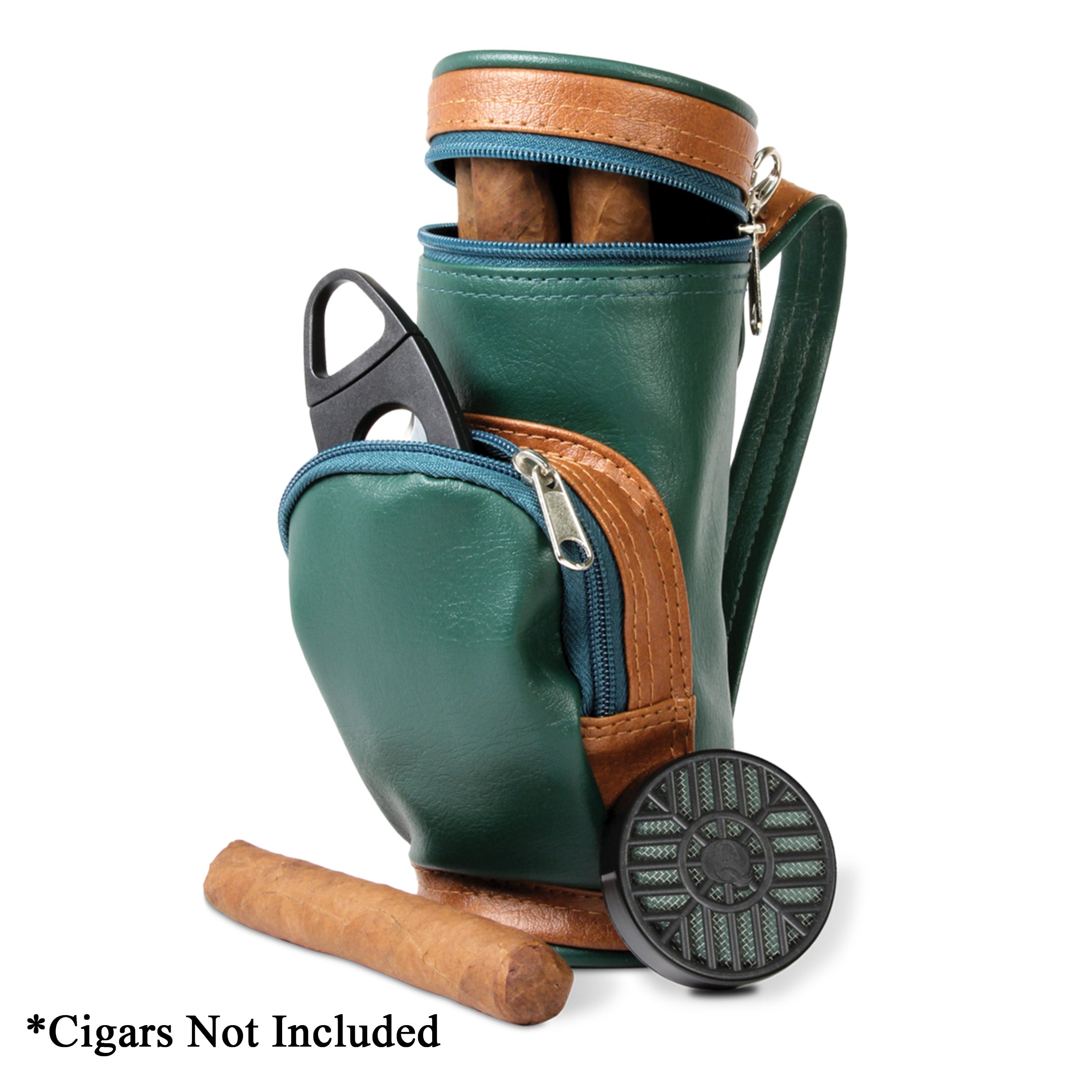 A novel gift for those those that love the art of golf while enjoying cigars.  This mini "golf bag" travel humidor can fit 6 to 8 cigars comfortably upright, depending on size and features a useful front pocket to hold cigar accessories such as a cutter and lighter.  The humidor section is plastic lined to provide a seal, while the humidifier puck can be mounted to the lid.  It has a small clip to attach to a golf bag.  We would recommend this as a short term humidor to hold sticks in for a few weeks or so, during a golf trip or until you smoke and reload.
